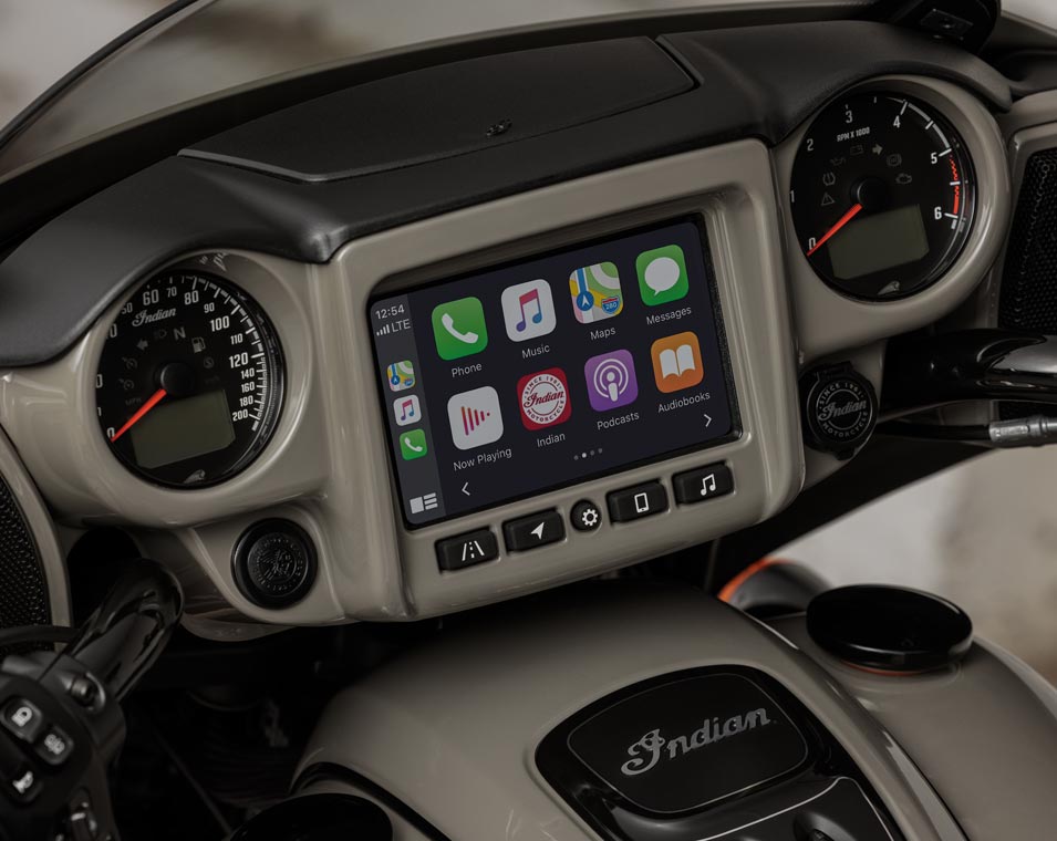 | System informacyjno-rozrywkowy | Współpracujący z systemem Ride Command 7-calowy ekran dotykowy: 7-calowy wyświetlacz dotykowy, na który składają się następujące wskazania i funkcje: zegar, wskazania temperatury zewnętrznej, kurs, wyświetlacz systemu audio, stan połączenia Bluetooth dla telefonu i zestawu słuchawkowego, informacje o stanie technicznym (ciśnienie w oponach, napięcie, czas pracy silnika, termin wymiany oleju), informacje o pojeździe (prędkość, zasięg, prędkość obrotowa, wybrany bieg), bieżące parametry jazdy (odległość, czas jazdy, czas postojów, wysokość nad poziomem morza, zmiany wysokości), liczniki przebiegu dziennego, wybór trybu jazdy, ustawienia jasności ekranu, wskazania komunikatów diagnostycznych oraz funkcja Apple CarPlay. |