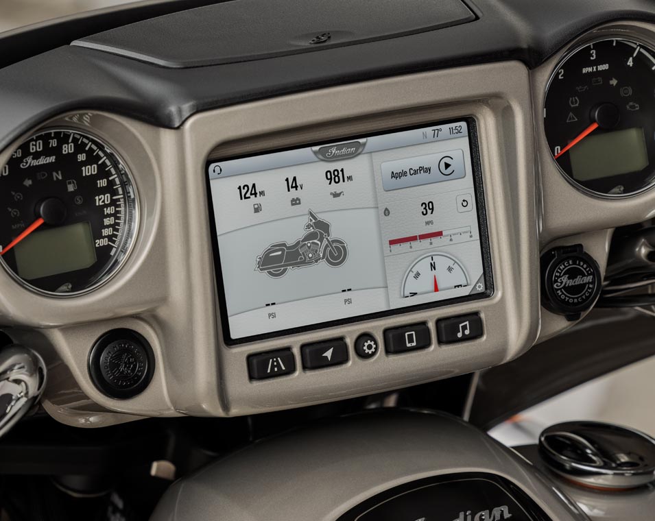 | System informacyjno-rozrywkowy | Współpracujący z systemem Ride Command 7-calowy ekran dotykowy: 7-calowy wyświetlacz dotykowy, na który składają się następujące wskazania i funkcje: zegar, wskazania temperatury zewnętrznej, kurs, wyświetlacz systemu audio, stan połączenia Bluetooth dla telefonu i zestawu słuchawkowego, informacje o stanie technicznym (ciśnienie w oponach, napięcie, czas pracy silnika, termin wymiany oleju), informacje o pojeździe (prędkość, zasięg, prędkość obrotowa, wybrany bieg), bieżące parametry jazdy (odległość, czas jazdy, czas postojów, wysokość nad poziomem morza, zmiany wysokości), liczniki przebiegu dziennego, wybór trybu jazdy, ustawienia jasności ekranu, wskazania komunikatów diagnostycznych oraz funkcja Apple CarPlay. |