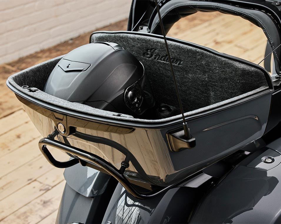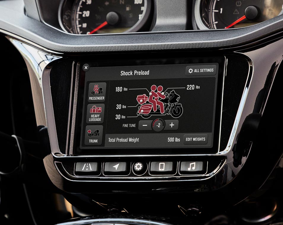 | Wyposażenie standardowe | Technologia Smart Lean, tylne zawieszenie z elektroniczną regulacją naprężenia wstępnego, podgrzewane siedzenie, światła drogowe wbudowane w dolne owiewki, schowki w dolnych owiewkach, współpracujący z systemem Ride Command 7-calowy ekran dotykowy oraz Apple CarPlay, wybór trybu jazdy, funkcja odłączania tylnego cylindra, tempomat, system monitorowania ciśnienia w oponach, kufry i bagażnik zamykane na pilot, ponad 130 l przestrzeni bagażowej, gmole, regulowane podstopnie pasażera, hamulce Brembo, ABS, zapłon bezkluczykowy, owiewka mocowana do ramy, elektryczna przednia szyba, regulowane nawiewy w owiewkach, podgrzewane manetki, system audio o mocy 200 W z radiem AM/FM, funkcją Bluetooth, gniazdem USB, wejściem na smartfona oraz gniazdo ładowania 12 V |
