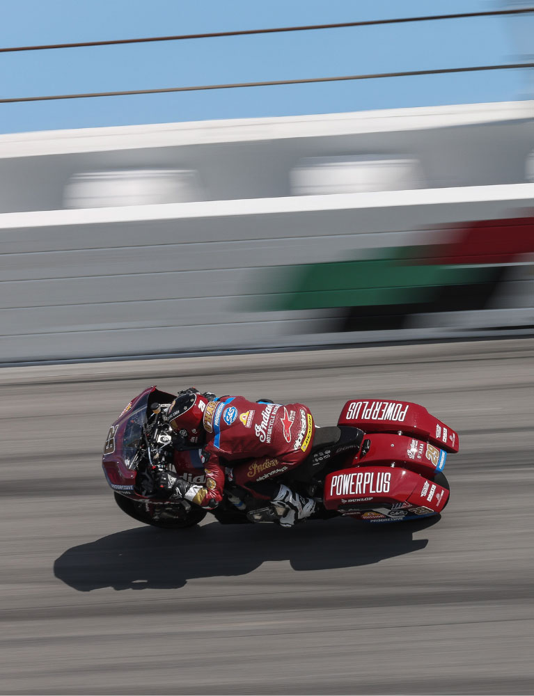 W 1909 roku wygraliśmy pierwszy wyścig motocyklowy na torze Indianapolis Motor Speedway. W 1937 roku Ed Kretz wygrał pierwszy wyścig Daytona 200 na Indian Sport Scout. Pierwotna ekipa Wrecking Crew zdominowała powojenną scenę wyścigową. Kontynuowaliśmy tę tradycję, organizując wyścigi Flat Tracking Racing w latach 2010-2019. Dzisiejsi zawodnicy robią to samo w Bagger Racing League Europe i serii MotoAmerica King of The Baggers. Inne epoki. Ten sam wynik.
